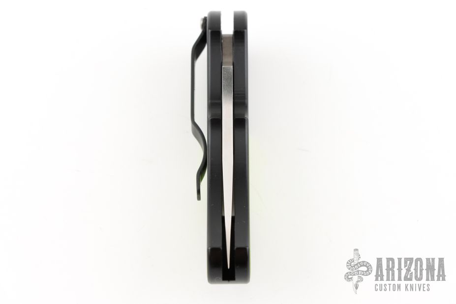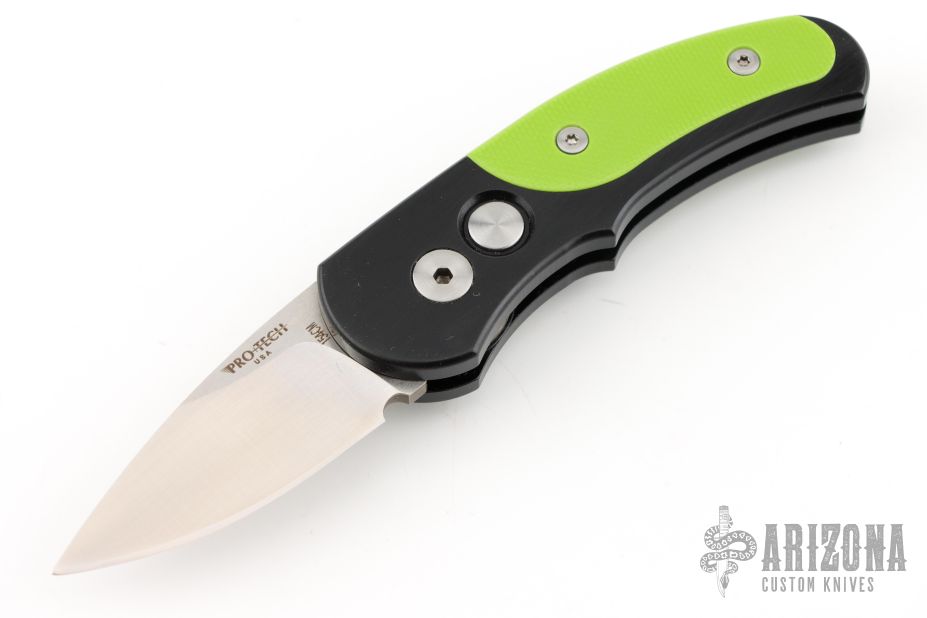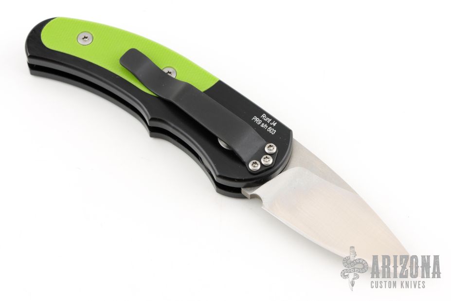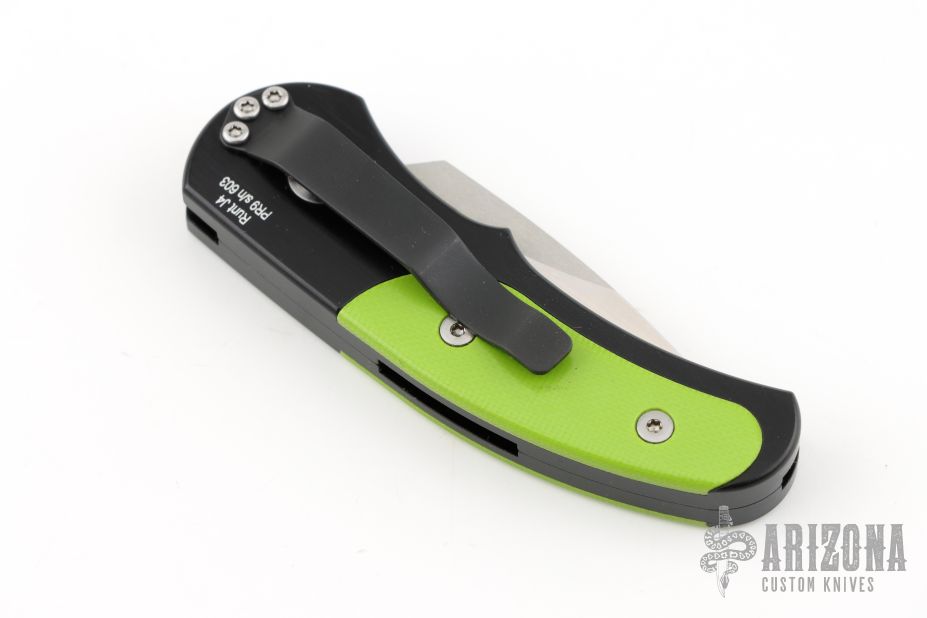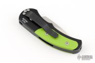 This is a Runt J4 "Jalapeno" by Pro-Tech featuring a black handle with neon green G-10 inlays and a satin blade. Coil spring. California legal. PR9 and s/n 603. Excellent condition. Comes with original box and papers.