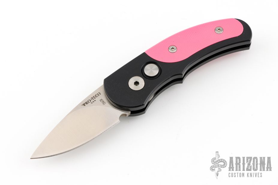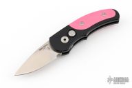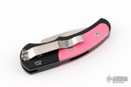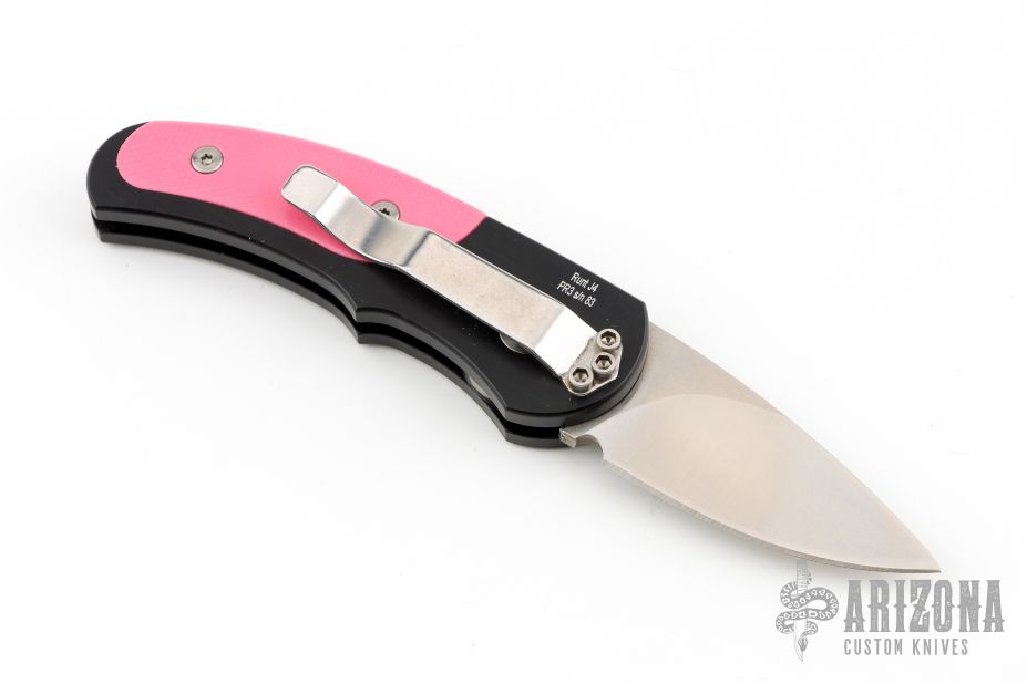 This is a Runt J4 "Jalapeno" by Pro-Tech featuring a black handle with pink G-10 inlays and a satin blade. Coil spring. California legal. PR3 and s/n 83. Excellent condition. Comes with original box and papers.