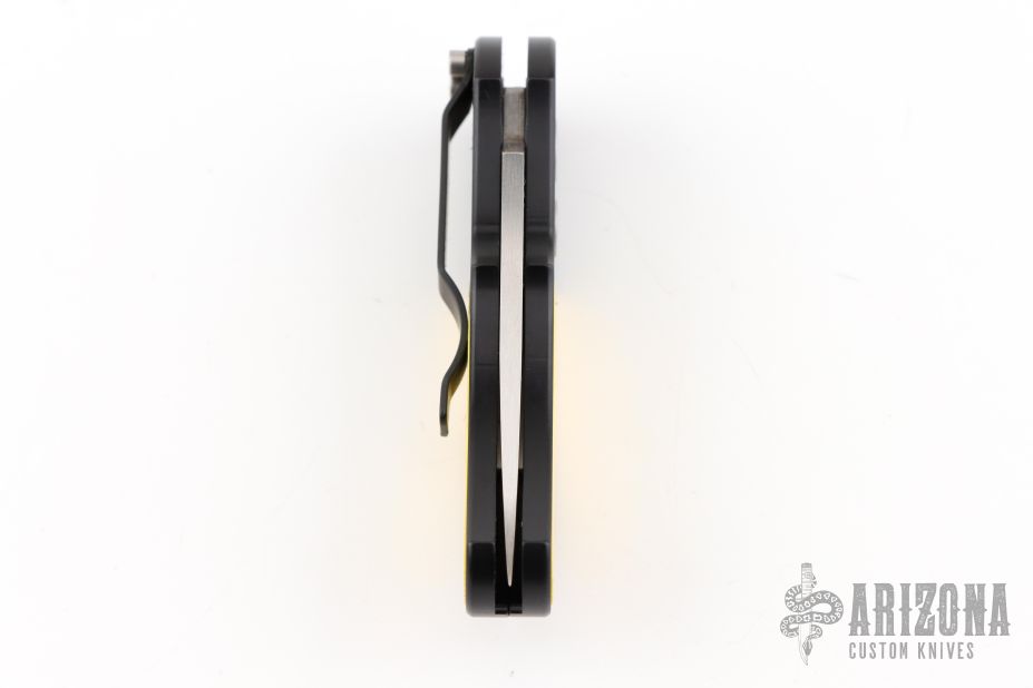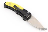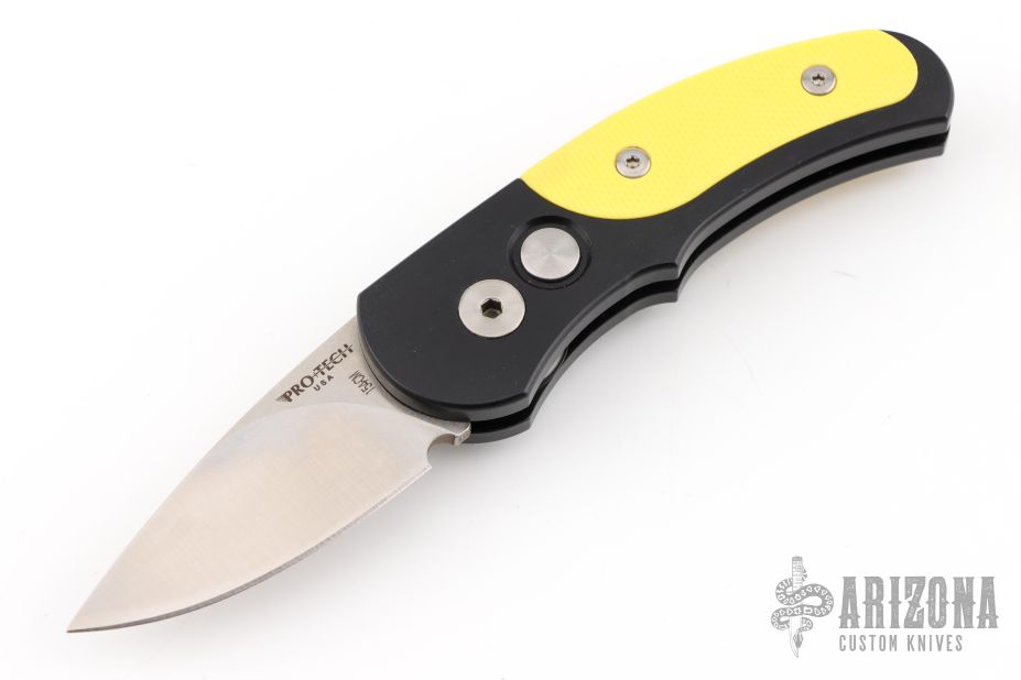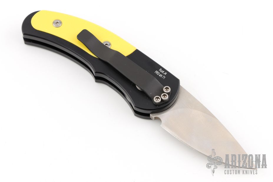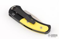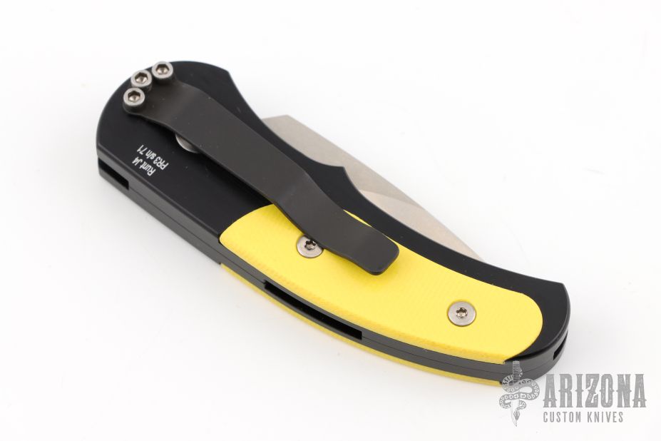 This is a Runt J4 "Jalapeno" by Pro-Tech featuring a black handle with yellow G-10 inlays and a satin blade. Coil spring. California legal. PR3 and s/n 71. Excellent condition. Comes with original box and papers.