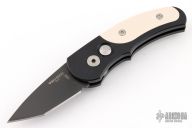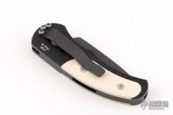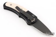 This is a Runt J4 "Jalapeno" by Pro-Tech featuring a black handle with ivory paper micarta inlays and a black tanto blade. Coil spring. California legal. FPR s/n 125. Excellent condition. Comes with original box and papers.