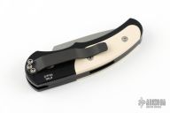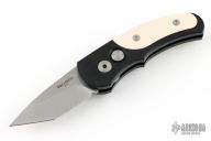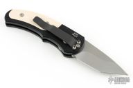 This is a Runt J4 "Jalapeno" by Pro-Tech featuring a black handle with ivory paper micarta inlays and a stonewashed tanto blade. Coil spring. California legal. FPR s/n 57. Excellent condition. Comes with original box and papers.