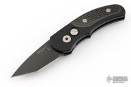 This is a Runt J4 "Jalapeno" by Pro-Tech featuring a black aluminum handle with carbon fiber inlays and a black tanto blade. Coil spring. California legal. FPR s/n 123. Excellent condition. Comes with original box and papers.