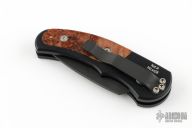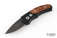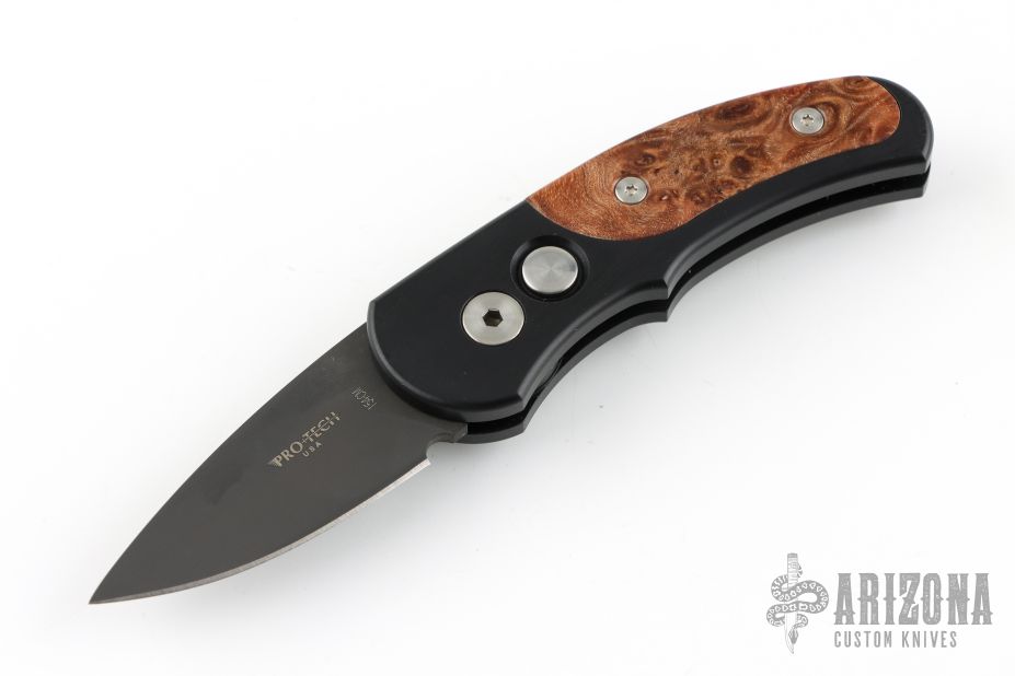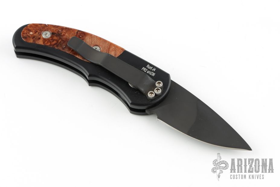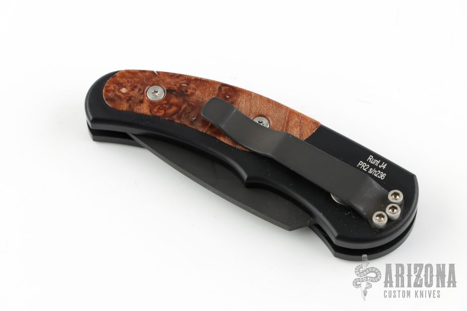This is a Runt J4 "Jalapeno" by Pro-Tech featuring a black handle with maple burl inlays and a black blade. Coil spring. California legal. PR2 and s/n 236. Excellent condition. Comes with original box and papers.