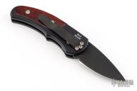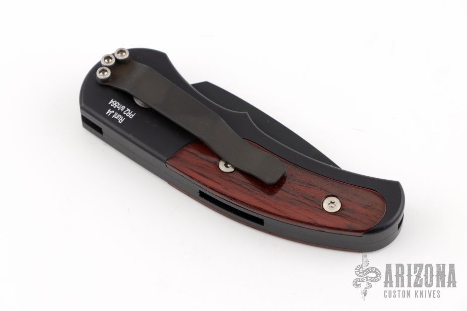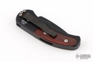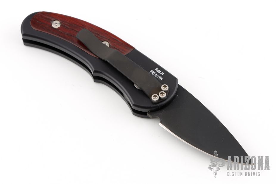 This is a Runt J4 "Jalapeno" by Pro-Tech featuring a black handle with cocobolo inlays and a black blade. Coil spring. California legal. PR2 and s/n 564. Excellent condition. Comes with original box and papers.
