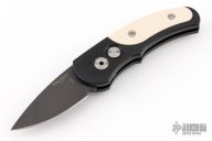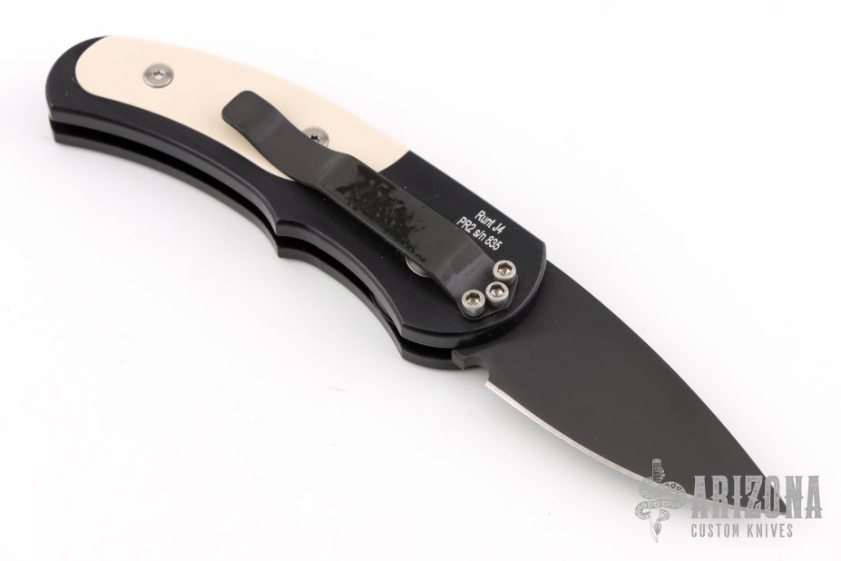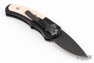 This is a Runt J4 "Jalapeno" by Pro-Tech featuring a black handle with ivory paper micarta inlays and a black blade. Coil spring. California legal. PR2 and s/n 835. Excellent condition. Comes with original box and papers.