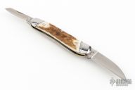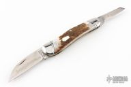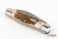 This slipjoint by Schatt and Morgan features two satin finished blades with nail nicks.  The handle features stainless steel bolsters, nickel silver liners and stag covers. Stainless steel springs. Has a few light scratches, otherwise excellent condition.  1 of 150