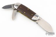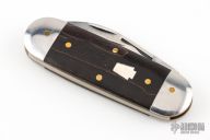This slipjoint by Schatt and Morgan features satin finished blades with nail nicks. The handle features stainless steel bolsters, brass liners and wood covers. Stainless steel springs. Has scratches, otherwise good condition. 1 of 50