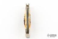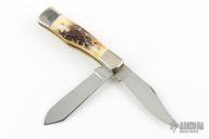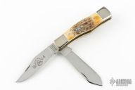 This slipjoint by Schatt and Morgan features two mirror finished blades with nail nicks. The handle features nickel silver bolsters, brass liners and stag covers. Steel springs. Has some light scratches, otherwise excellent condition.