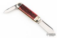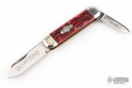 This slipjoint by Schatt and Morgan features two mirror finished blades with nail nicks.  The handle features nickel silver bolsters, brass liners and jigged bone covers. Stainless steel springs. Has some light scratches, otherwise excellent condition.