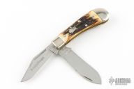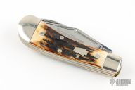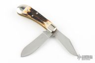 This slipjoint by Schatt and Morgan features two mirror finished blades with nail nicks. The handle features nickel silver bolsters, brass liners and stag covers. Steel springs. Has some light scratches, otherwise excellent condition.