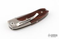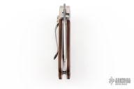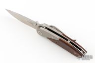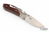 This linerlock by Lion Steel features a satin finished drop point blade with dual thumbstuds and a notched thumbrest. The handle has titanium bolsters and wood scales over stainless steel liners. Has some scuffs and some spots on the blade, otherwise good condition.