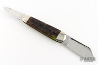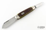 This slipjoint by Schatt and Morgan features two mirror finished blades with nail nicks.  The handle features nickel silver bolsters, brass liners and jigged bone covers. Stainless steel springs. Has some light scratches, otherwise excellent condition.  1 of 100 and dated 2004