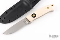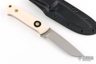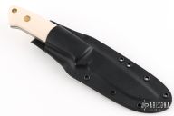 This K-22 Buffalo River Hunter by Dozier Knives features a satin finished blade with .137" blade stock and .907" blade depth, full tang construction. The handle has ivory paper micarta scales with black paper micarta inserts and liners, brass pins and lanyard hole. Comes with kydex sheath with belt loop. New from maker.