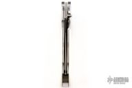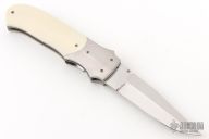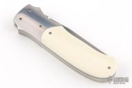 This linerlock folder is a collaboration between John Young and Bill Ankrom, and features a hand-rubbed satin finish blade with false top edge, has a single thumbstud. The handle has hand rub satin finished 416 stainless steel bolsters, and walrus ivory scales with black liners, satin finished titanium liners, stainless steel backspacer.  Smooth action.  Nice detent, blade seating and lockup. Outstanding fit and finish. Young's mark is on the blade and Ankrom's is on the interior. Comes with a zippered case. New from maker!