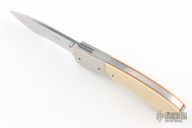 This linerlock folder is a collaboration between John Young and Bill Ankrom, and features a hand-rubbed satin finish blade with a single thumbstud. The handle has hand rub satin finished 416 stainless steel bolsters, and 1975 Westinghouse ivory paper micarta scales with red liners, satin finished titanium liners, stainless steel backspacer.  Smooth action.  Nice detent, blade seating and lockup. Outstanding fit and finish. Young's mark is on the blade and Ankrom's is on the interior. Comes with a zippered case. New from maker!