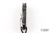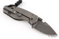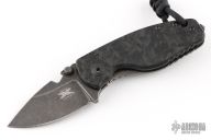 This HEAT/ F Plain Edge Framelock Folder has a black tumbled German Niolox stainless steel drop point blade with dual thumb studs, bottle opener, and a notched thumbrest. Handle is chard carbon fiber and gunmetal tumbled titanium, with a black stainless steel tip up clip and removable glass breaker, lanyard hole. Comes with original box. Has a couple light scuffs, excellent condition otherwise.