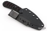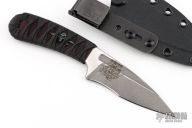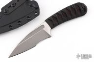 This SIN by Bastinelli Knives features a two-tone finished blade with notched thumbrest and fullers, .138" blade stock and 1.241" blade depth, full tang construction. The handle has a custom cord wrap and a menuki. Comes with kydex sheath and zippered case. Excellent condition.