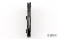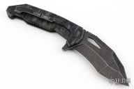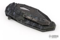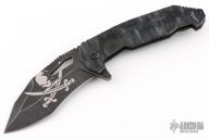 This Akrav Gen3 Flipper by Lotar features a black stonewashed blade with notched thumbrest and flipper. The handle has an urban camo finished titanium frame, backspacer and tip up clip. Comes with original box. Has some minor wear on the frame finish, otherwise excellent condition.