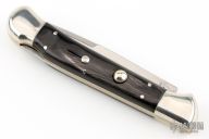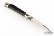 This Lockback Auto by Dolphin D.M. features a tumble polished spear point blade with false top edge. The Dolphin stamp is a partnership between Lucio DeBon and Francesco Mariani Lucio. The handle has nickel silver bolsters, buffalo horn scales, brass liners, stainless backspacer. Excellent condition.