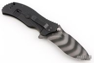This 0301 frame-lock assisted flipper by Zero Tolerance features a recurve spear-point blade with a tiger stripe finish, stainless steel liner green G10 scale, and black titanium scale with a black G-10 backspacer. It also features the Speed-safe assisted opening system. Tumble finished black stainless steel clip and lock bar stabilizer. Clip is 4-way reversible. S/N 10306. Has scuffs and scratches, good condition otherwise.
