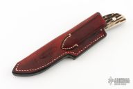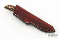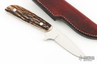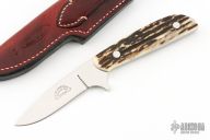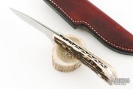 This knife by Dave Kauffman has a mirror polished blade .125" blade thickness and .797" bladed depth, full tang construction. The handle has stag scales with steel pins and a fileworked tang. Brown leather sheath. Excellent condition.