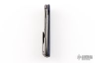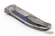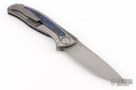 This Hati Gen3 by Shirogorov Knives features a drop point blade with notched thumbrest and flipper. The handle has Blue Techno Carbo and titanium frame with Blue Techno Carbo inlay, titanium tip up clip with hidden screws, titanium backspacer with lanyard hole. Rides on bearings, nice detent, lockup and blade seating. Comes with COA and original box. Excellent condition.