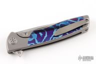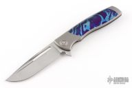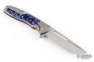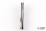 This Mini EVO Flipper from Brian Nadeau features a polished Damasteel blade with a fullers, thumbhole, flipper and notched thumbrest. The handle is comprised of a bead blasted titanium frame with Timascus inlays, satin titanium tip up clip. Rides on bearings, nice detent, lockup and blade seating, stainless lockface insert. Has some light scuffs and scratches, otherwise good condition. Comes with original box.