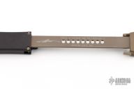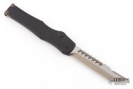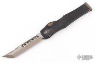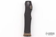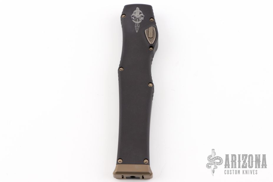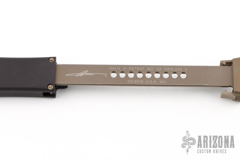 This Halo VI features a bronzed Hellhound tanto blade with satin flats, fullers and notched spine. Its handle is made from black Mil-Spec anodized alloy with bronzed hardware. The charging handle comes marked with the Microtech logo and date of creation along with the serial number. Microtech's Halo VI sets itself apart from previous models with added safety features and an improved charging handle mechanism. The firing button has been upgraded with an integrated safety to prevent accidental deployment. Its upgraded charging handle is built with dual pivoting latches that create a secure seal in the closed position. Comes with original box and papers. Dated 09/2018 and #051. Excellent condition.