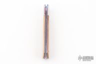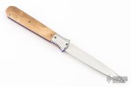 This Icepick by Rainy Vallotton features a mirror finished dagger style blade with false top edge. The handle has fileworked stainless steel bolsters and push button, mammoth ivory scales over fileworked and anodized titanium liners and fileworked stainless steel backspacer. Has a few very light scratches, otherwise excellent condition.