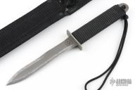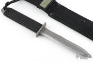 This PB-3W by EK Knives features a bead blasted blade with sharpened top edge, .155" blade stock and 1.042" blade depth, hidden tang construction. The handle has a blasted stainless steel guard and black paracord wrapped handle. Comes with nylon sheath. Has some scuffs and scratches, has been resharpened, otherwise good user condition.