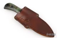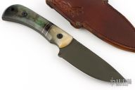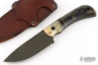 This Cav by Half Face Blades features a black coated blade with a notched thumbrest, .149" blade stock, 1.485" blade depth, full tang construction. The handle has rams horn bolsters, dyed maple burl scales, black liners, black/copper/raffir Nobel spacers. Comes with original box, papers and leather belt sheath set up for horizontal or vertical carry. Excellent condition.
