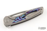 This Apex Flipper from Brian Nadeau features a Damasteel blade with a thumbhole, flipper and notched thumbrest. The handle has a bead blasted titanium frame with timascus inlays, satin titanium tip up clip. Rides on bearings, nice detent, lockup and blade seating, stainless lockface insert. Has a couple light scuffs, and scratches on the clip, great condition otherwise.
