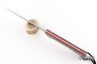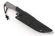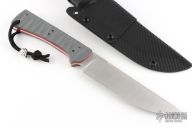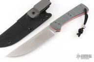 This Bowie by David Lancaster Clark features a satin finished blade with false top edge, .165" blade stock and 1.490" blade depth, full tang construction. The handle has gray G-10 scales with red liners, fileworked tang spine. Comes with a kydex sheath. New from maker.