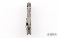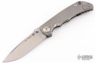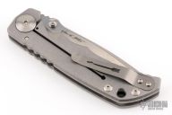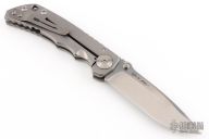 This framelock folder by Spartan Blades features a stonewashed drop point blade with dual thumbstuds and a notched thumbrest. The handle has a stonewashed titanium frame with tip up titanium clip. Has nice detent, lockup, and blade seating. Comes with original box.  Excellent condition.