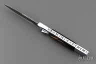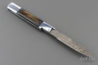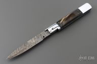 This Picklock Auto by Agasi Hambartsumian of Armenian Doctor Knives features a Damascus bayonet ground blade with a false top edge. The handle has a polished stainless steel frame with fileworked stainless steel backspacer, buffalo horn scales with brass pins. New from maker.