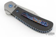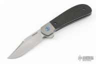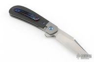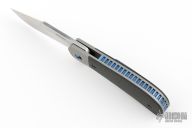 This Lanny's Clip flipper from Enrique Pena features a hand rub satin finished blade with swedge and notched flipper. The handle has a bead blasted titanium frame with carbon fiber scales, blue anodized titanium backspacer and hardware, tip up bead blasted titanium clip. Nice detent, lockup and blade seating, rides on bearings. Comes with a zippered case. Has a couple light scuffs, otherwise Excellent condition.