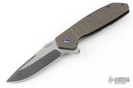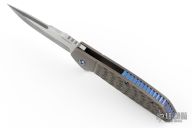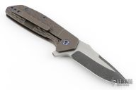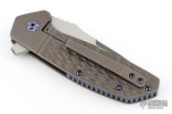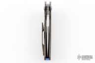 This Stinger flipper from Enrique Pena features a two-tone finished drop point blade with notched thumbrest and flipper and a false top edge. The handle has a bead blasted and anodized titanium frame with a matching tip up pocket clip.  Anodized titanium backspacer.   Very nice detent, lockup and blade seating. Comes with a zippered case. Has some scuffs and scratches, great condition otherwise.