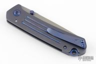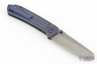 This Mid-Utility by Richard Rogers features a bead blasted blade with false top edge and anodized titanium thumbstuds. The handle has a milled and anodized titanium frame with anodized titanium tip up clip and backspacer with lanyard hole, has anodized titanium screws and pivot collars. Nice detent, lockup and blade seating. Inside of frame is milled with a checkered pattern. Comes with a zipper case. Has some scuffs and scratches, great condition otherwise.