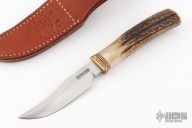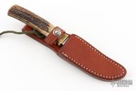 This knife has a satin finished blade with sharpened top edge, .161" blade stock and .942" blade depth, hidden tang construction. The handle has a reduced brass hilt with red, white and blue spacers and a stag grip. Comes with a brown leather sheath and a Randall zippered case. Excellent condition.