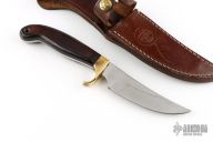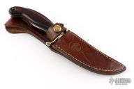 This knife by Olsen Knives features a satin finished blade with .183" blade stock and 1.119" blade depth, full tang construction. The handle has a brass guard and rosewood scales. Comes with a brown leather sheath. Has some scratches, has been resharpened, otherwise good condition.