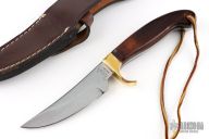 This knife by Olsen Knives features a nearly mirror finished blade with .181" blade stock and 1.098" blade depth, full tang construction. The handle has a brass guard and rosewood scales. Comes with a brown leather sheath. Has some light staining on the blade, otherwise good condition.