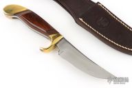 This knife by Olsen Knives features a satin finished blade with .185" blade stock and 1.104" blade depth, full tang construction. The handle has a brass guard and dymondwood scales with brass rear bolsters. Comes with a brown leather sheath. Excellent condition.