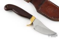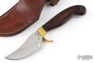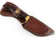 This knife by Olsen Knives features a satin finished blade with .185" blade stock and 1.470" blade depth, full tang construction. The handle has a brass guard and rosewood scales. Comes with a brown leather sheath. Has some scratches, otherwise good condition.