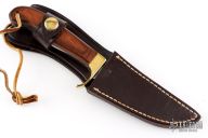 This knife by Olsen Knives features a satin finished blade with .186" blade stock and .819" blade depth, full tang construction. The handle has a brass guard and rosewood scales. Comes with a brown leather sheath. Has light scratches and pitting, otherwise good condition.
