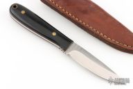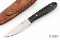 This knife from Gib Guignard features a drop point satin finish blade with .119" blade stock and .770" blade depth, full tang construction. The handle has black paper micarta scales over red liners. Includes a brown leather sheath. Has a couple small spots near the tip, otherwise excellent condition.