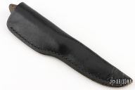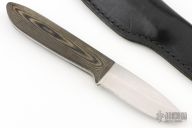 This knife by Newt Livesay features a satin finished blade with .138" blade stock and .923" blade depth, full tang construction. The handle has black linen micarta scales. Comes with a black leather sheath. Excellent condition.