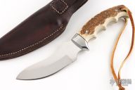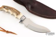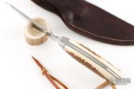 This knife by RJ Bosshardt features a mirror finished blade with .125" blade stock and 1.573" blade depth, full tapered tang construction. The handle has stainless steel bolsters and stag scales with black/white spacers. Comes with a brown leather sheath. Dated 1998. Has a few light scratches, otherwise excellent condition.