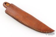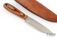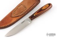 This knife from Gib Guignard features a drop point satin finish blade with .124" blade stock and .956" blade depth, full tang construction. The handle has dymondwood scales. Includes a brown leather sheath. Has a couple light scratches, otherwise excellent condition.
