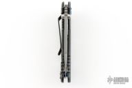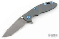 This 3" Harpoon Tanto from Hinderer Knives features a 3" working finished harpoon tanto shaped blade, textured gray G-10 scale and a battle black finished titanium handle and clip, blue titanium hardware. Clip can be mounted for tip up or down carry. Nice lockup, seating, and detent. Comes with original box and extra hardware. New Condition.