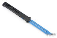 Joining the Estiletto OTF lineup is this fantastic model with a USA cutout on the black anodized aluminum body with black hardware/clip and a blue coated dagger blade with partially serrated top edge.
